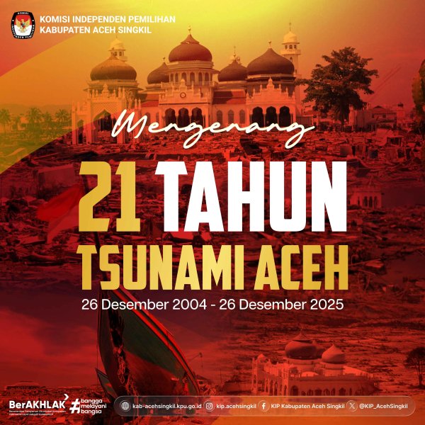 Salam #TemanPemilih, Mengenang 21 Tahun Tsunami Aceh. Luka mungkin telah mengering, namun do’a tak pernah berhenti. Mari kita tundukkan hati mengenang para syuhada tsunami, serta memanjatkan doa untuk saudara-saudara kita yang tertimpa musibah banjir dan longsor di Aceh. Semoga Allah memberi rahmat, kekuatan, dan perlindungan bagi kita semua. #KIPAcehSingkil #KIPAceh #KIPMelayani #KPUMelayani ....