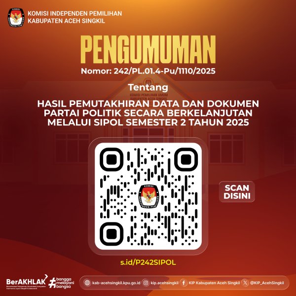 Salam #TemanPemilih, Pengumuman Nomor: 242/PL.01.4-Pu/1110/2025 Tentang Hasil Pemutakhiran Data Dan Dokumen Partai Politik Secara Berkelanjutan Melalui Sipol Semester 2 Tahun 2025. Dapat di unduh melalui link : s.id/P242SIPOL atau scan QR Code di postingan #KIPAcehSingkil #KIPAceh #KPUMelayani ....