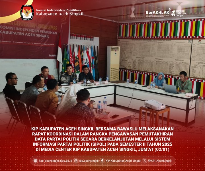 Salam #TemanPemilih, KIP Kabupaten Aceh Singkil Bersama BAWASLU Melaksanakan Rapat Koordinasi Dalam Rangka Pengawasan Pemutakhiran Data Partai Politik Secara Berkelanjutan Melalui Sistem Informasi Partai Politik (SIPOL) Pada Semester II Tahun 2025 Di Media Center KIP Kabupaten Aceh Singkil, Jum’at (02/01) #KIPAcehSingkil #KIPAceh #KPUMelayani ....
