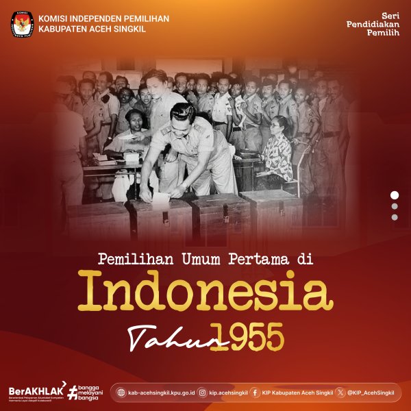 Salam #TemanPemilih, Mari sejenak kita menengok ke belakang, ke momen bersejarah Pemilu pertama tahun 1955. Sebuah pesta demokrasi yang sering dicatat sebagai salah satu yang paling demokratis dalam sejarah bangsa. Fakta menariknya, antusiasme rakyat kala itu luar biasa tinggi. Lebih dari 39 juta pemilih menggunakan hak suaranya, mencatatkan angka partisipasi hingga 90%! Sebuah angka yang fantastis di tengah usia Republik yang masih sangat muda. Kilas Balik 5 Besar Perolehan Suara 1955: PNI (22,3% - 57 kursi) Masyumi (20,9% - 57 kursi) NU (18,4% - 45 kursi) PKI (16,4% - 39 kursi) Partai lainnya (22%) Sejarah ini mengajarkan kita bahwa partisipasi adalah kunci. Mari kita warisi semangat para pendahulu. Untuk generasi masa kini, jadikan hak suaramu sebagai kontribusi nyata bagi masa depan Indonesia. Jangan Golput, Yuk Memilih! #KIPAcehSingkil #KIPAceh #KIPMelayani #KPUMelayani #PendidikanPemilih #PendidikanPemilihBerkelanjutan ....