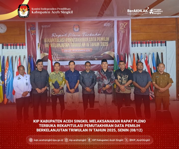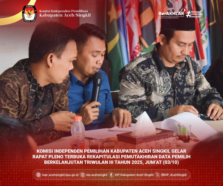 Aceh Singkil, [02/10/2025] – Komisi Independen Pemilihan (KIP) Kabupaten Aceh Singkil melaksanakan kegiatan Coklit Terbatas (COKTAS) pada tanggal 24 - 26 September 2025. Langkah ini merupakan bagian penting dari upaya Pemutakhiran Data Pemilih Berkelanjutan (PDPB) yang terus dilakukan oleh KIP untuk memastikan akurasi dan kemutakhiran Daftar Pemilih Tetap (DPT) di tingkat kabupaten.