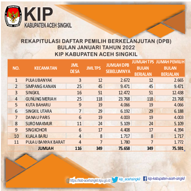 Dengan demikian, Data Pemilih Bekelanjutan Kabupaten Aceh Singkil Periode September 2021 yang berjumlah 75.553 orang bertambah 43 orang pada bulan Oktober. Sehingga Data Pemilih Berkelanjutan Kabupaten Aceh Singkil Periode Oktober 2021 menjadi 75.596 orang.